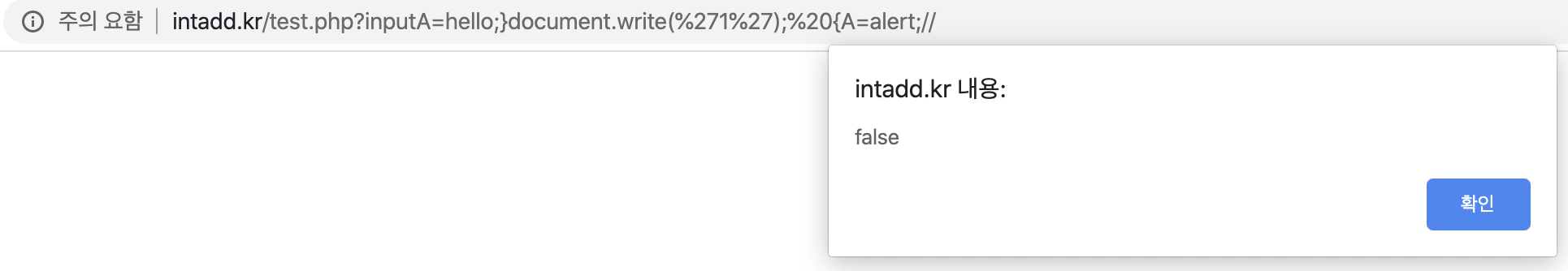 input 값 : inputA=hello;}document.write('1'); {A=alert;//