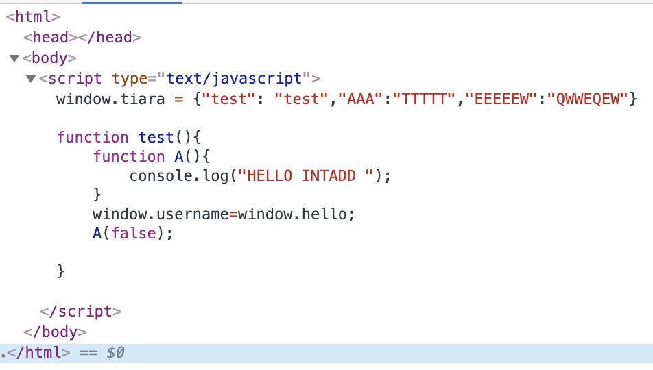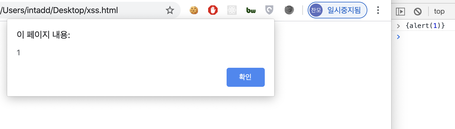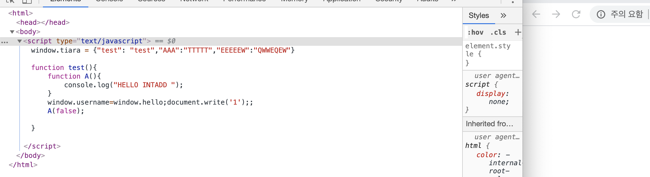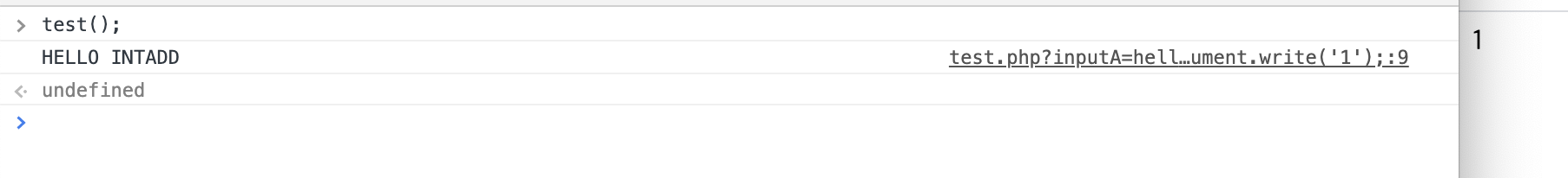 Console을 통해 test() 함수를 호출하면, log를 정상적으로 찍고, 저희가 기입한 js (1을 document 에 write) 코드도 잘 작동을 합니다.