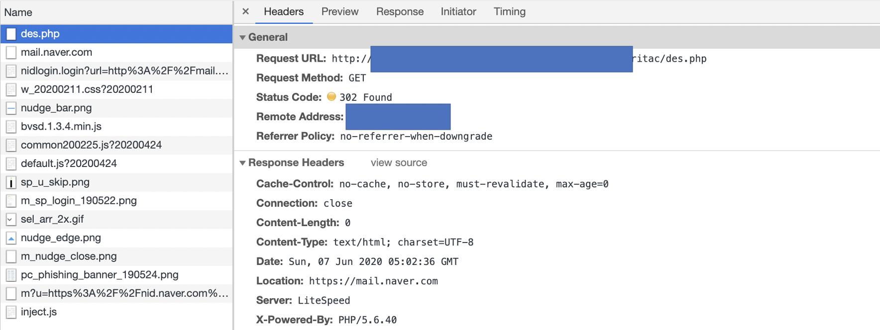 ID/PW 를 위 서버 des.php 로 전송한 후, 응답은 302로 mail.naver로 보냅니다.