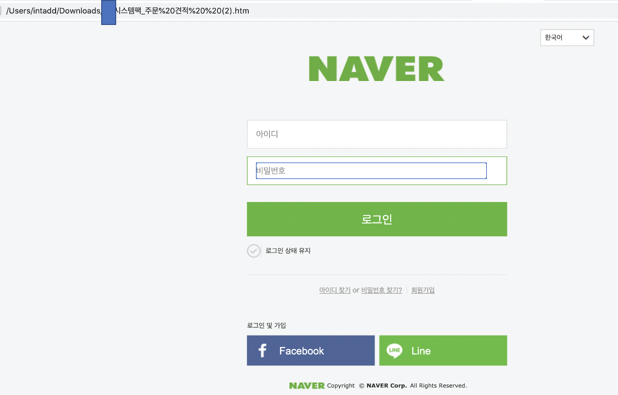 실수로 저에게 네이버 ID /PW 를 요청하는 견적서.htm을 보냈으며 (해당 ID/PW는 위의 도메인으로 전송)